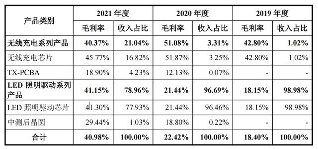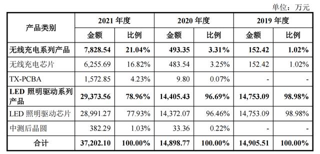 美芯晟是一家Fabless模式的芯片設(shè)計企業(yè),主營產(chǎn)品為LED照明驅(qū)動系列和無線充電系列兩部分,目前LED照明產(chǎn)品收入占比最大,接近80%,不過在2021年之前,此業(yè)務占比均在95%以上。