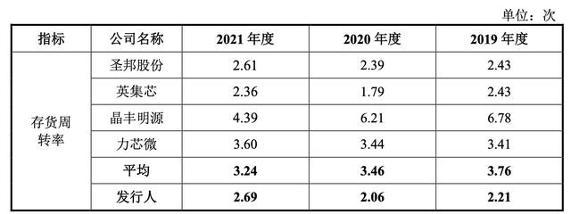 然而,美芯晟的產(chǎn)品競爭力可能不及公司陳述的那么強。從存貨周轉(zhuǎn)率中也可見一斑,報告期內(nèi),其存貨周轉(zhuǎn)率與同行可比公司有一定差距,2019-2021年公司存貨周轉(zhuǎn)率分別為 2.21、2.06和2.69,行業(yè)均值為3.76、3.46和3.24。