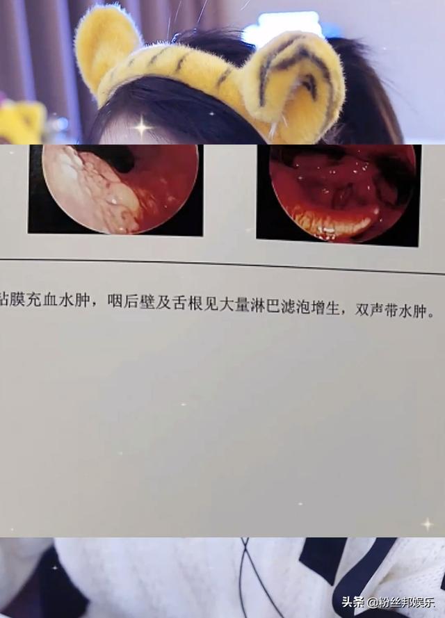檢查結(jié)果顯示文兒聲帶已經(jīng)發(fā)炎,濾泡性咽炎+聲帶炎必須得停播調(diào)養(yǎng)嗓子。