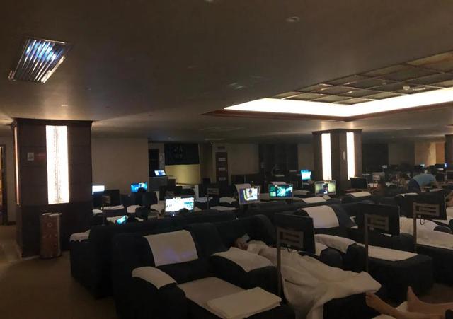 二樓區(qū)域是休息區(qū),主要是按摩區(qū)、躺椅區(qū)和客房。休息區(qū)的躺椅數(shù)量是有限的,每個躺椅上還配了電視機(jī),如果坐滿了,那只能坐椅子上休息了??头渴切枰~外收費(fèi)的。