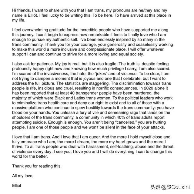 2021年5月21日,艾略特還曾在社交平臺(tái)上放出了一張照片,并配文“變性寶寶的第一條泳褲”,這也是他首次以一位男性的身份出現(xiàn)在大眾的事業(yè)里。