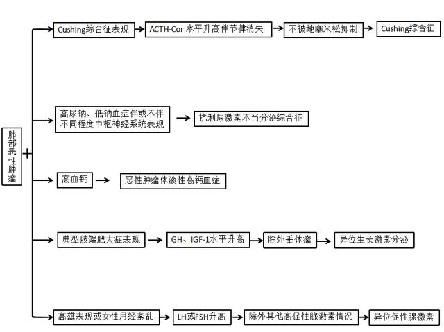 肺部腫瘤分泌激素,從而引起一系列內(nèi)分泌臨床綜合征,從屬于副瘤綜合征范疇,如圖1所示。