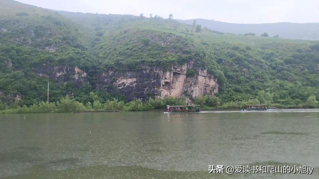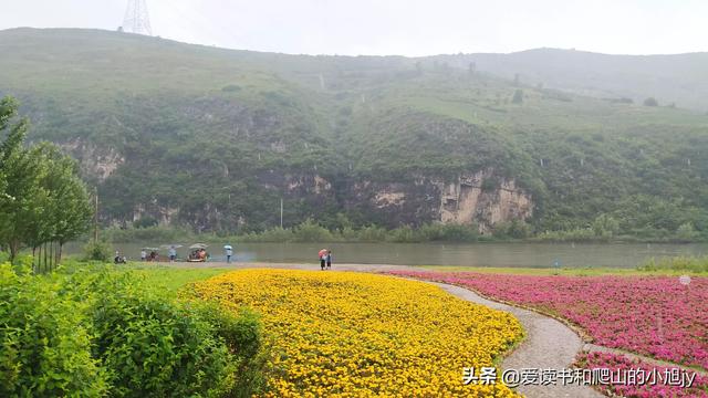 下車時(shí),雨還在淅淅瀝瀝地下著。細(xì)雨中,河岸上繽紛的小花讓我們眼前一亮。山略有朦朧,河水依山而流。水中有游船,船家正在招攬客人。