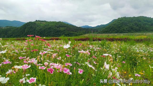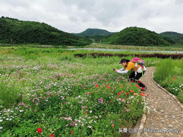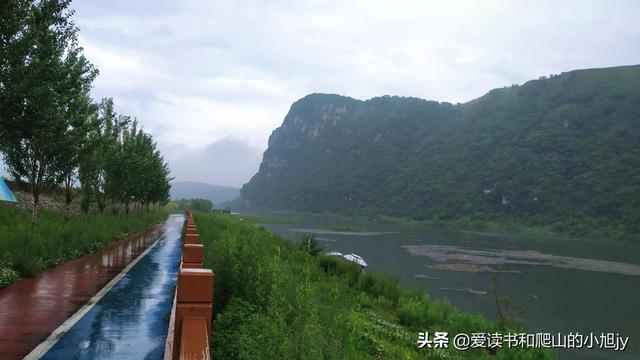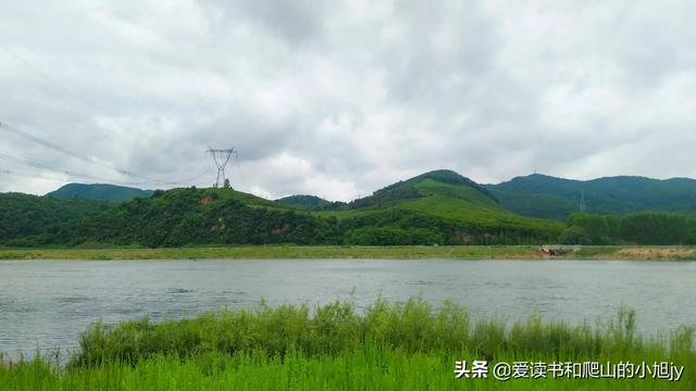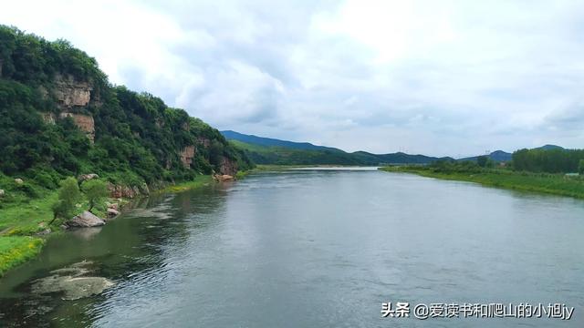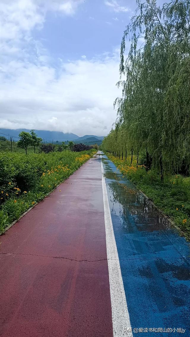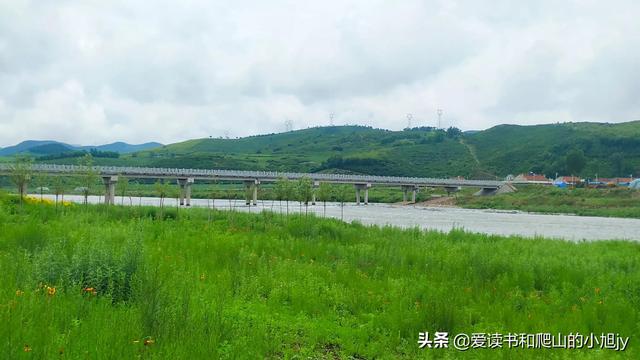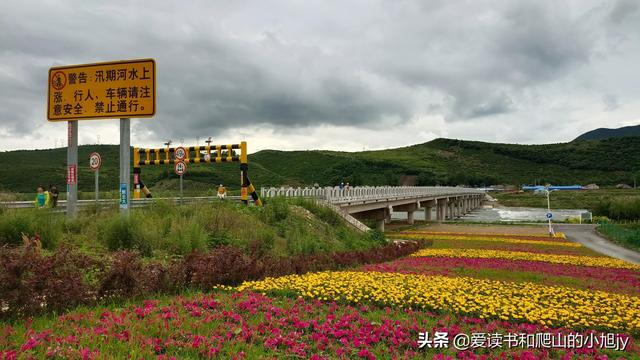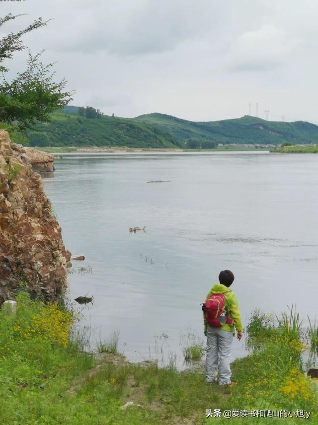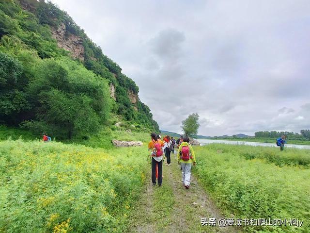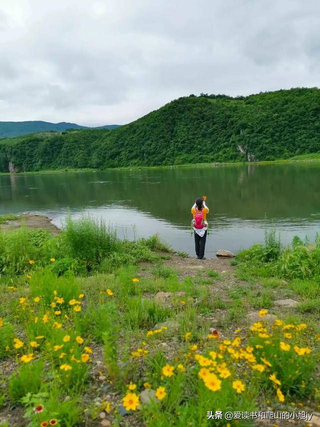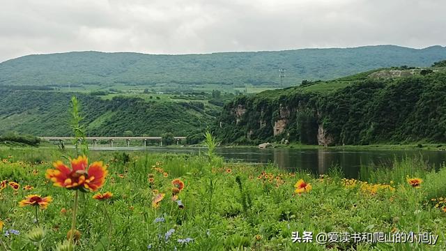 從鐮刀灣大橋下穿過,繼續(xù)向東走,到了沙土坎村附近。這片河道寬闊。雨已經(jīng)停了,水面恢復(fù)了平靜,河水映出了山的倒影。山水交融,鮮花綠草,我們要把這景色留在眼里,留在心里。