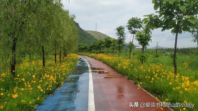 沿太子河岸修有綠道(綠道本身就是一道靚麗的風(fēng)景線),我們走綠道向東徒步。微雨,空氣濕潤、清新。依山臨水,彩色的綠道,綠道兩側(cè)的花花草草,景色賞心悅目。我們一行10人,興致頗高。