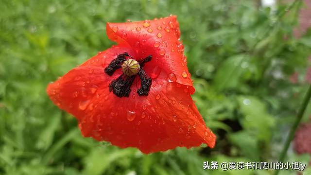 花一片又一片,這又有虞美人,帶著雨珠的虞美人,更加?jì)善G。